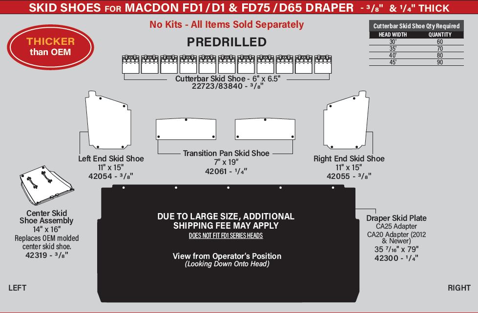 Replacement UHMW poly skid shoes for MacDon grain platforms. May Wes Premium Poly Skid Shoes are made in U.S.A. exclusively from virgin UHMW-PE in our Hutchinson, Minnesota, plastic fabrication and compression molding shop. We never use reground UHMW or inferior plastics. Insist on the best poly skid shoes/skid pads for your grain head. Demand May Wes Poly!