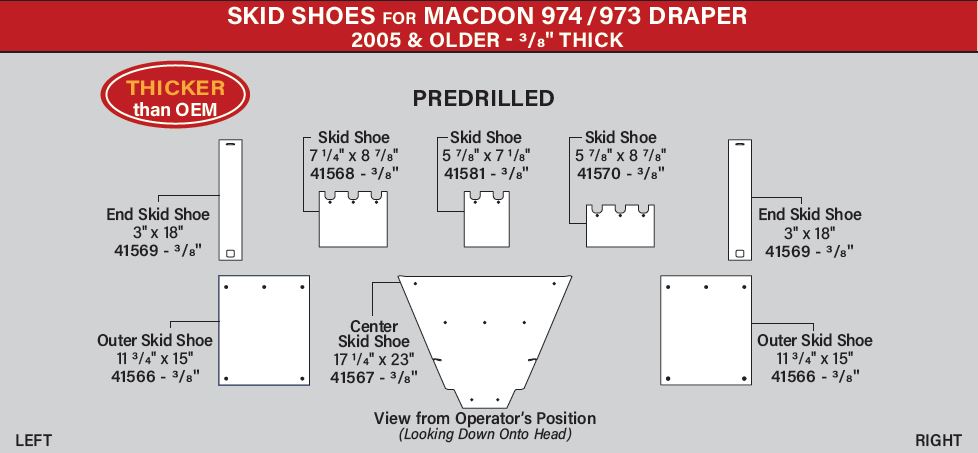 UHMW Poly Skid Shoe Kits for for MacDon grain heads. May Wes Premium Poly Skid Shoes/Skid Pads, are made in U.S.A. in our Hutchinson, Minnesota plastic fabrication and compression molding shop. May Wes Premium Poly Skid Shoes are made exclusively from virgin UHMW-PE. We never use recycled UHMW or inferior plastics that wear out faster. Insist on the best Poly Skid Shoes for your MacDon grain head. Demand May Wes Poly Skid Shoes.